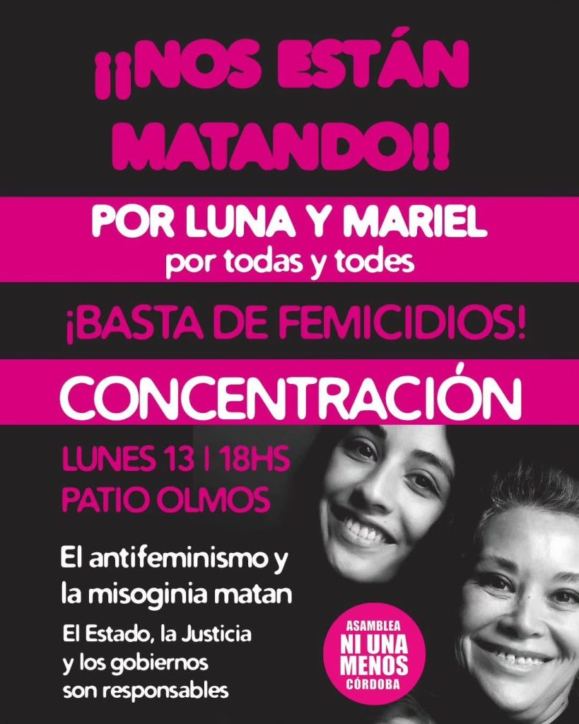 Desde la Asamblea Ni Una Menos de Córdoba convocan a concentrar hoy a las 18 horas en el Patio Olmos, en reclamo de justicia por Luna Giardina y Mariel Zamudio.